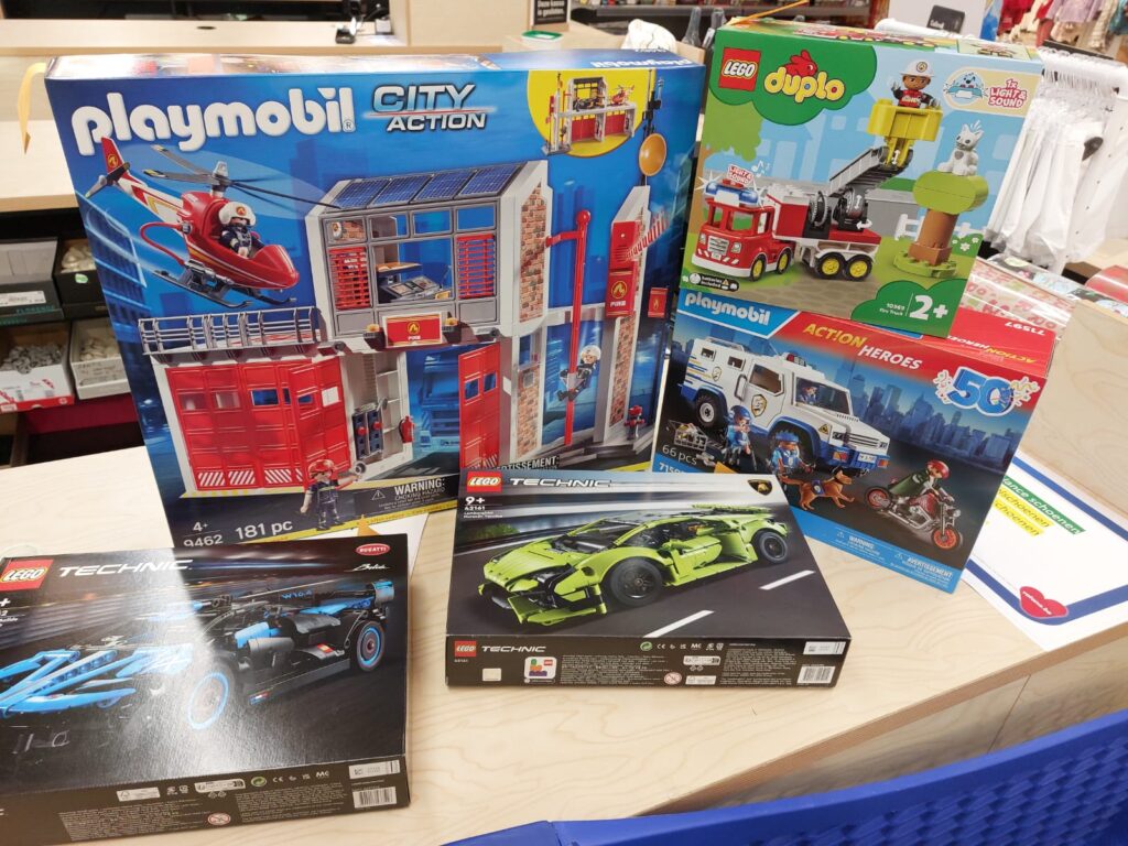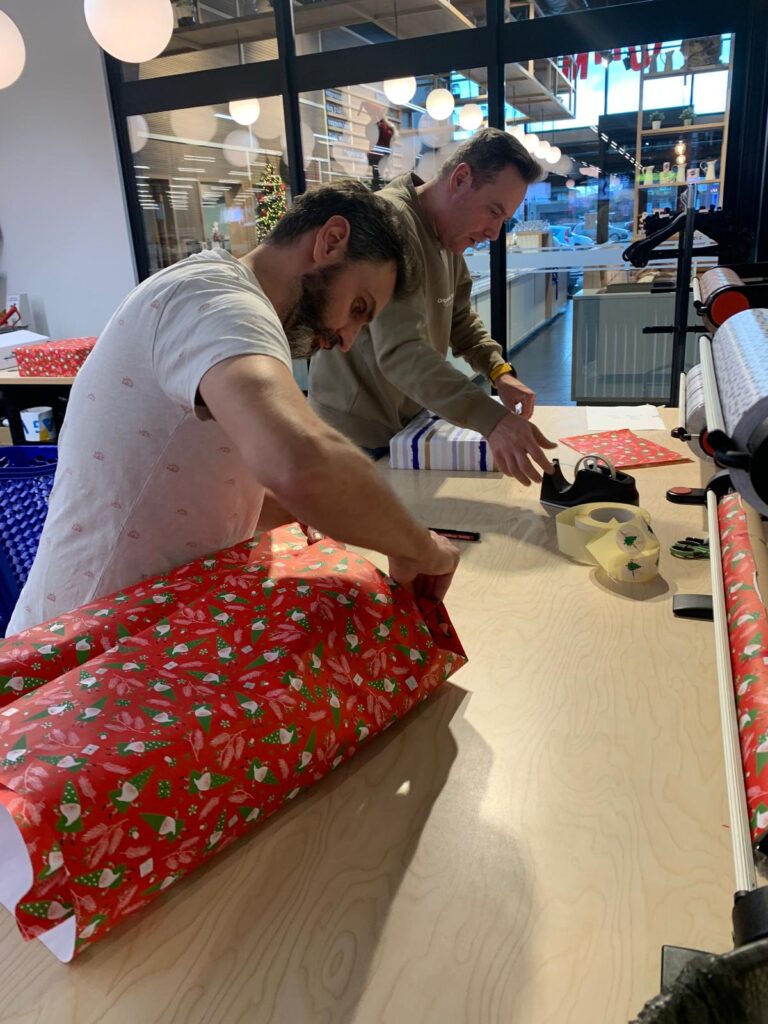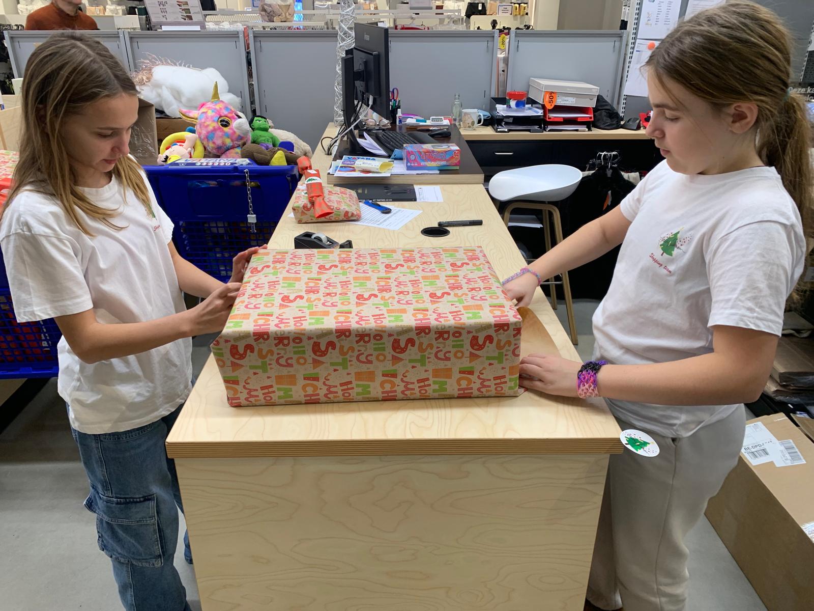 lokale speelgoedwinkel en zorgen dat alles gekocht, mooi ingepakt en gelabeld wordt.